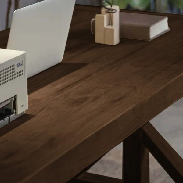 يأتي سطح الطاولة بلون خشبي طبيعي دافئ، وهو لون محايد يعكس فخامة الخشب ويضيف إحساساً بالسكينة على المساحة المحيطة، مما يساعد على زيادة التركيز.