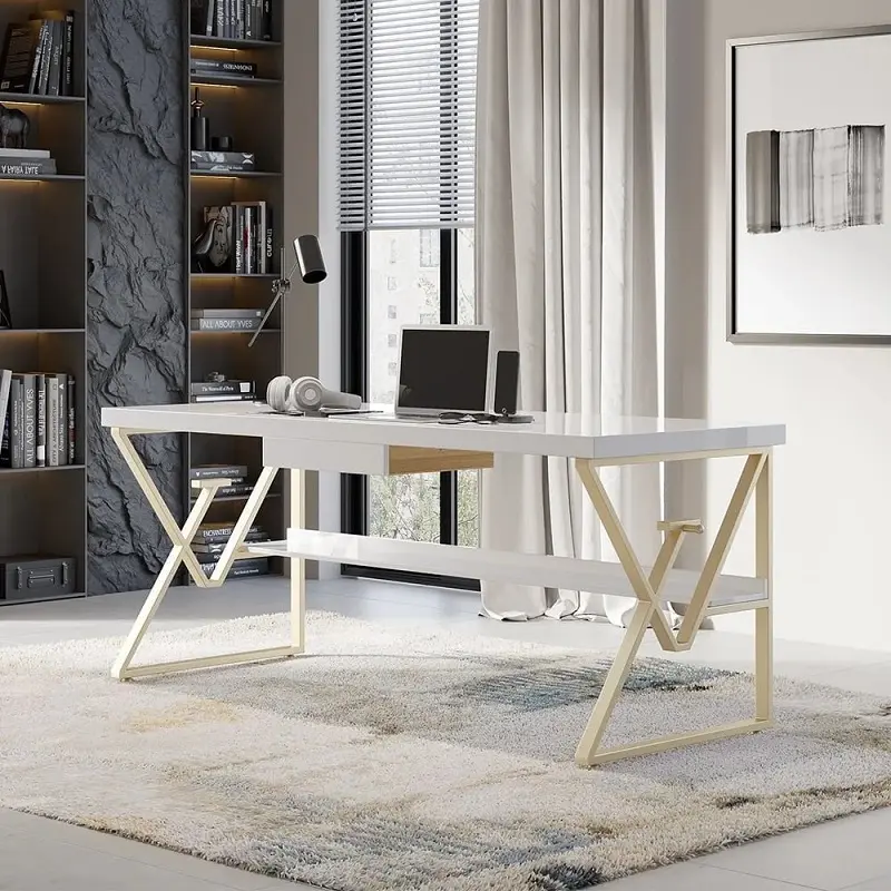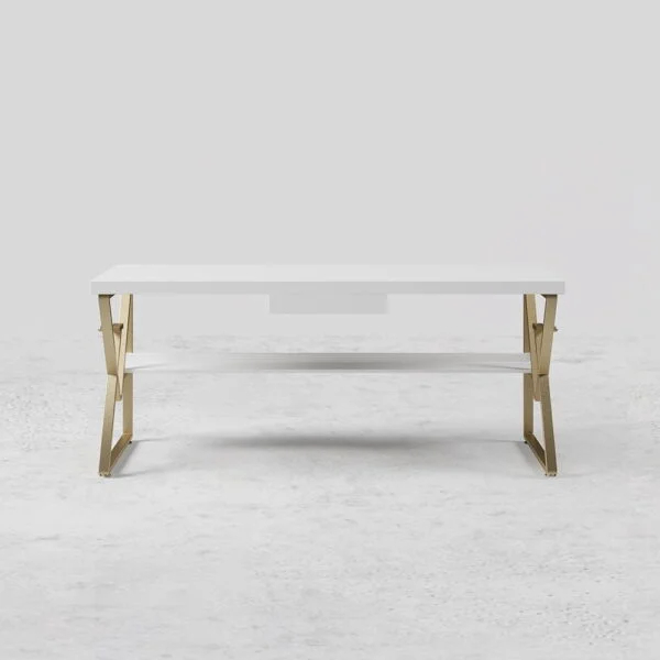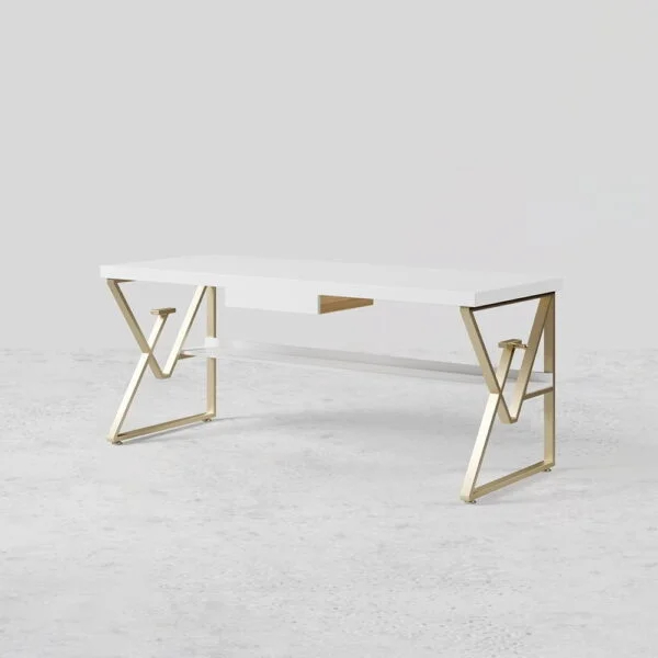تعتمد متانة هذا المكتب بشكل أساسي على هيكل معدني عالي الجودة، يظهر في إطار قوي ومتين يمنح القطعة ثباتاً تاماً ويتحمل الأوزان الثقيلة، وقد تم اختيار اللون الذهبي للقاعدة المعدنية بعناية ليخلق تبايناً راقياً مع السطح الخشبي.