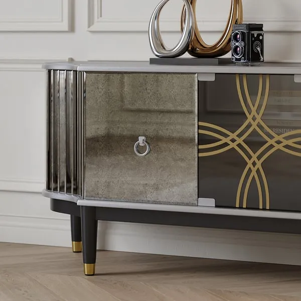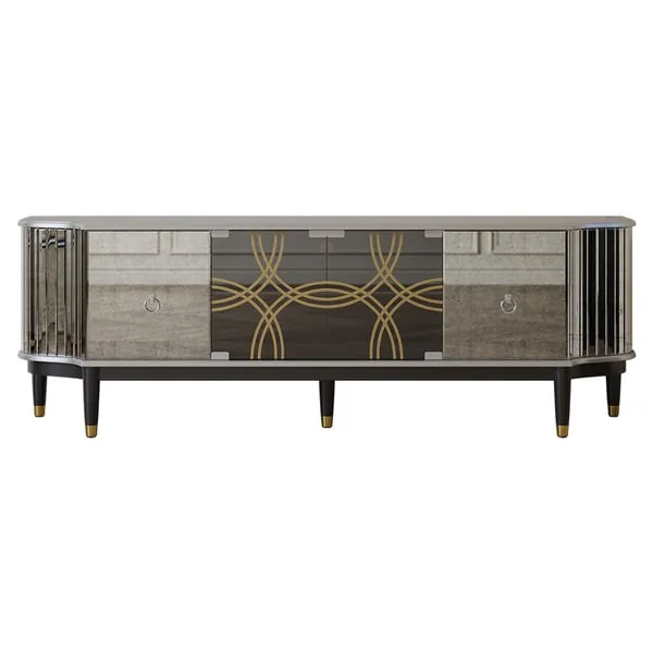 طاولة تلفاز بتصميم عصري مميز مصنوعة من خشب هندسي متين وخشب زان متين عالي الجودة وأبواب من الزجاج القوي النقي.