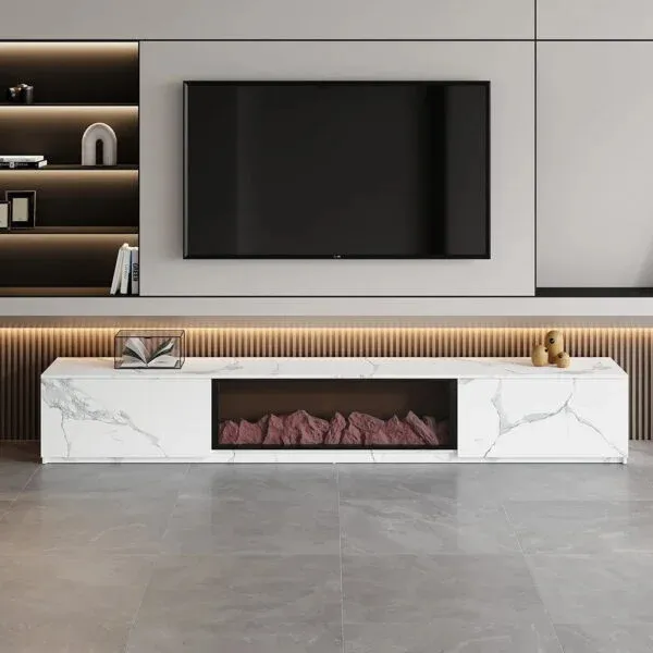 طاولة تلفاز عملية تجمع بين أناقة الخشب ودفء مدفأة كهربائية بتأثير لهب ثلاثي الأبعاد، مع تخزين منظم وسهولة تحكم عن بعد لتجربة مريحة طوال العام.