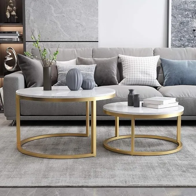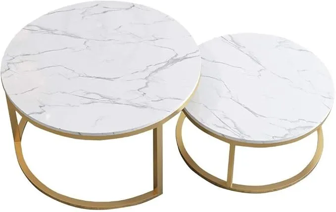 طاولات قهوة مستديرة عصرية أنيقة وعملية طاولتين دائريتين بمقاسين مختلفين، بسطح رخامي سهل التنظيف وهيكل معدني ثابت. مناسب لغرفة المعيشة ويمنحك مرونة في الترتيب مع خيارات لونية متناسقة.