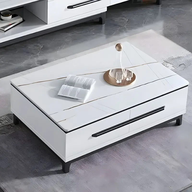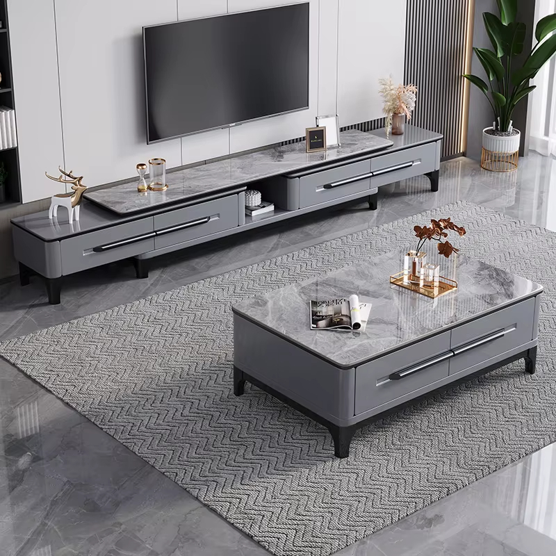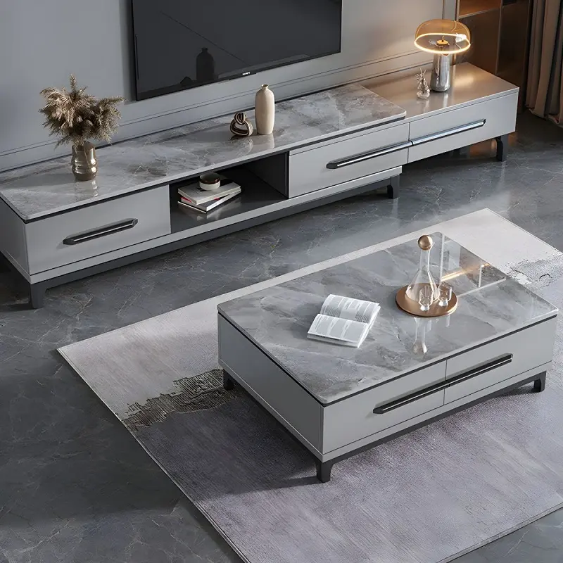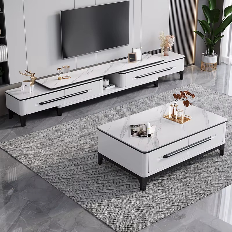 طقم طاولة تلفاز مع طاولة قهوة بتصميم عصري جذاب، مصنوع من خشب زان متين عالي الجودة وسطح رخامي أنيق، بلون أبيض رمادي متناسق، مثالي لغرفة المعيشة الحديثة في منازل الخليج.