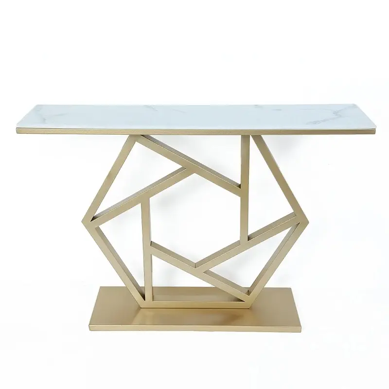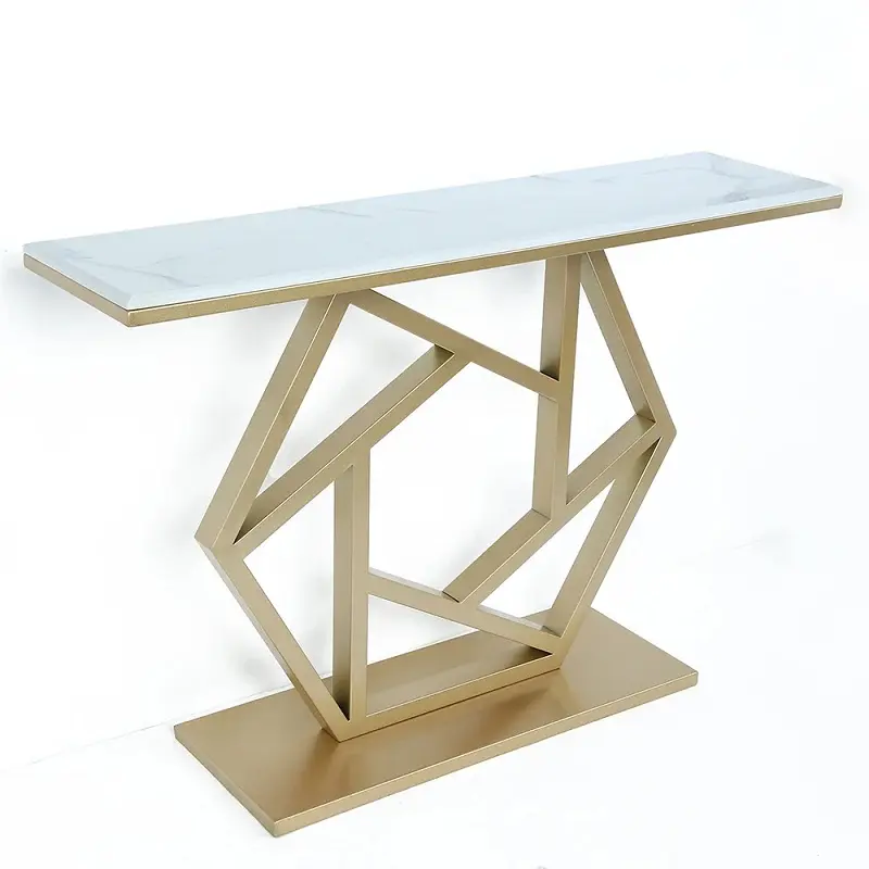 طاولة كونسول مستطيلة مع سطح من الرخام عملي وأنيق بسطح رخامي وهيكل معدني متين، تصميم عصري يناسب المداخل وغرف المعيشة في المنازل الخليجية. يتميز بمقاسات مثالية ولون أنيق كما في الصورة، مع ضمان سنتين ضد عيوب التصنيع داخل دول مجلس التعاون الخليجي.