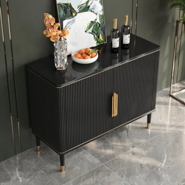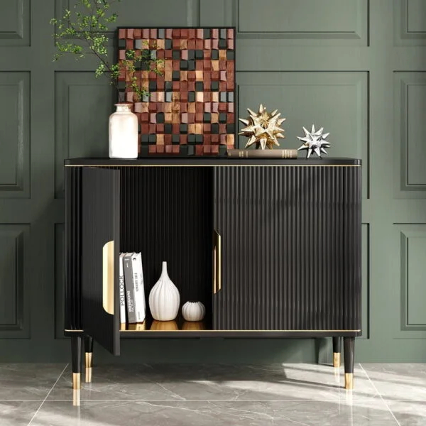 طاولة مدخل عملية بتصميم فاخر يوازن بين الأناقة والتنظيم. بابان مع رفوف داخلية للتخزين اليومي، وسطح علوي أملس يسهل تنظيفه وعرض الديكورات.