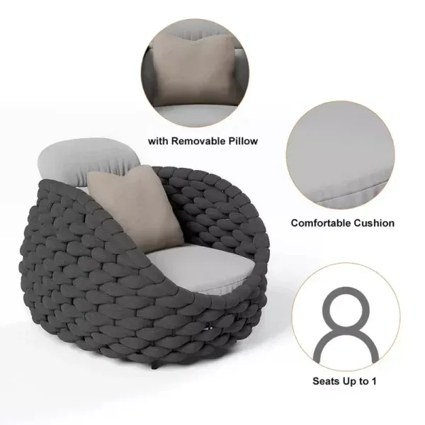 احصل على كرسي مفرد خارجي عصري بحبال منسوجة، يوفر الراحة والفخامة لمساحتك الخارجية. مع وسائد قابلة للإزالة وإطار مقاوم للعوامل الجوية، يعد هذا الكرسي استثمارًا رائعًا للأماكن الخارجية.
