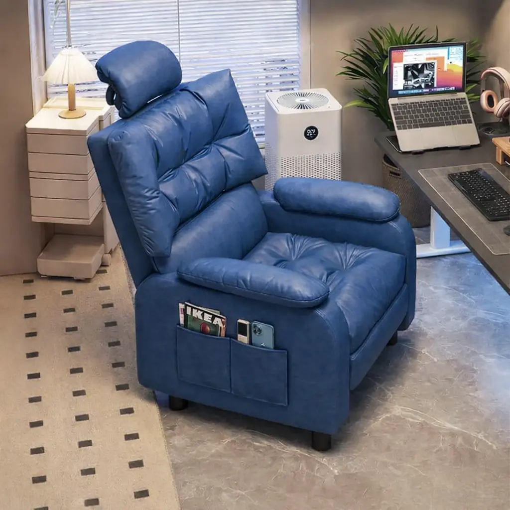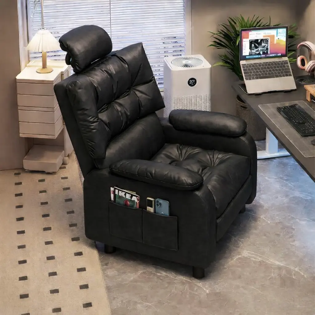 كرسي استرخاء جلدي بتصميم عصري مع مسند قدم، يوفر جلسة مريحة ودعماً متكاملاً للجسم ليكون إضافة مثالية إلى كنب غرفة معيشة أنيقة.