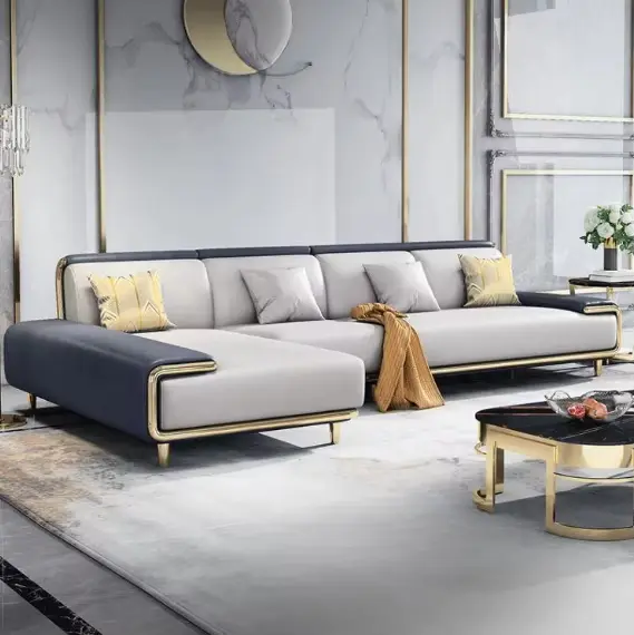 كنب زاوية رمادي فخمة مصممة بتفاصيل عصرية . تُعدّ كنبة الزاوية قطعة أثاث أساسية في أي منزل، حيث تُوفر مساحة جلوس واسعة ومريحة للاجتماعات العائلية أو الاسترخاء مع الأصدقاء. كما أنها تُضفي لمسة جمالية على الغرفة وتُكمل ديكورها.