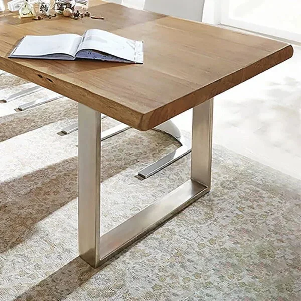 بينما يتميز السطح بخشبه الطبيعي الدافئ، فإن القاعدة تضيف لمسة عصرية وعملية. تم تصميم قاعدة الطاولة من معدن متين باللون الفضي، مما يوفر ثباتًا عاليًا ويمنح الطاولة مظهرًا متوازنًا بين الريفي والمعاصر. هيكل الطاولة قوي بما يكفي لتحمل الاستخدام اليومي الكثيف، مع الحفاظ على مظهرها الأنيق لسنوات طويلة.
