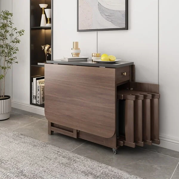 طقم عملي وأنيق لغرفة الطعام: طاولة مستطيلة قابلة للطي لتوفير المساحة، مع كراسٍ مريحة بتنجيد جلد سهل التنظيف وحشوة إسفنج لجلوس يومي مريح.