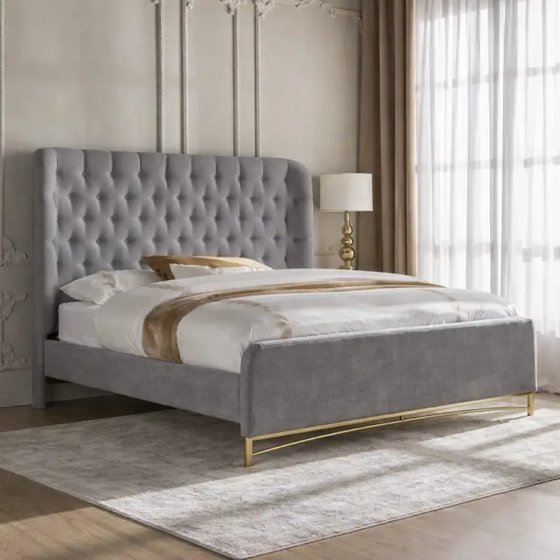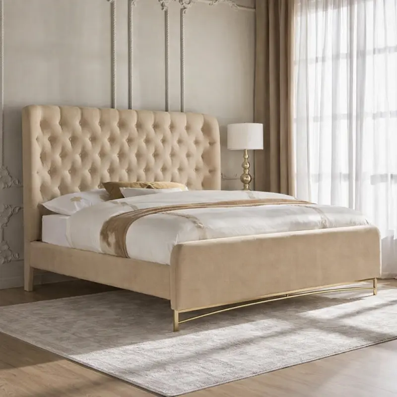 متجر ماستر روم يقدم سرير غرفة نوم كينج بتصميم فخم وأنيق. مصنوع من خامات عالية الجودة بلون بيج راقي ولمسات ذهبيةـ لوح خلفي مبطن كابيتونيه يضمن الراحة والفخامة.