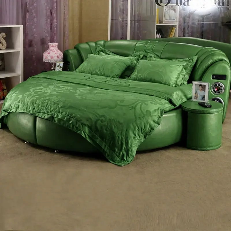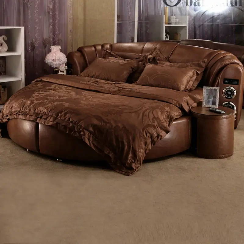 سرير دائري انيق بمميزات متعددة . مصنوع من أجود أنواع المواد، بما في ذلك هيكل من الخشب الهندسي وخشب الزان الروماني عالي الجودة، وطبقة من الجلد الإيطالي الفاخر. كما أنه مبطن بالاسفنج عالي الكثافة والمرونة ليمنحك شعوراً بالراحة والدعم أثناء النوم