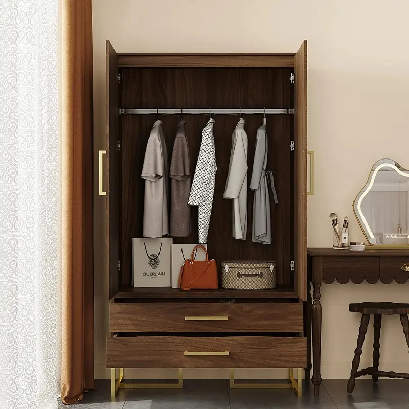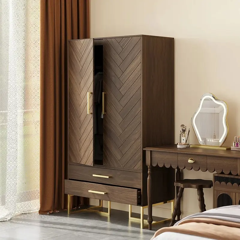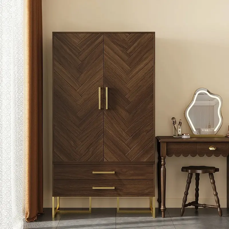 خزانة ملابس مع أدراج بتصميم عصري تم تصنيع هذة الخزانة من خشب هندسي وخشب زان روماني عالي الجودة، ما يمنحها قوة تحمل ممتازة وثباتًا طويل الأمد. هذه الخامات المختارة بعناية تضمن المتانة وتضيف شعورًا بالفخامة إلى الغرفة.