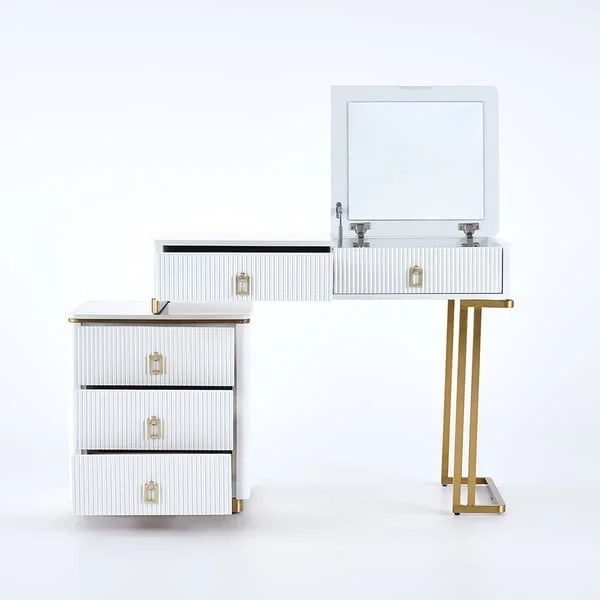 تسريحة عملية بتصميم عصري راقٍ تجمع بين سطح رخامي سهل العناية ومساحة تخزين مريحة. قابلة للتمديد لتناسب استخدامك اليومي كتسريحة أو مكتب، مع أدراج واسعة وخزانة جانبية لتنظيم مستلزماتك بأناقة.
