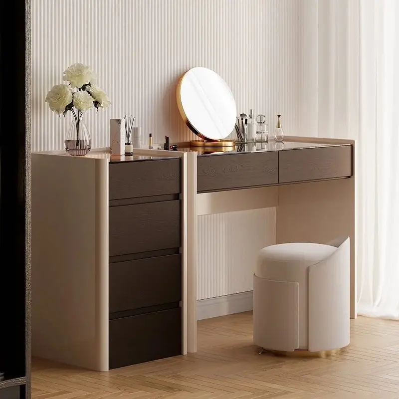 هذه طاولة تسريحة تجمع بين شكل حديث وإحساس فاخر يليق بغرفة النوم، مع سطح علوي من الزجاج المقسّى يمنحك مساحة عمل أنيقة ومتينة في الاستخدام اليومي. مظهرها متوازن، فتندمج بسهولة مع أنماط ديكور متعددة بدون أن تبدو مبالغًا فيها.