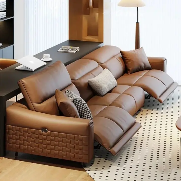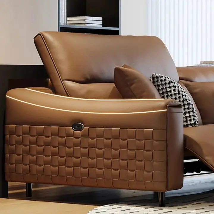 كنب صاله مريح​ مع مسند للقدم بتصميم فخم وفرناه  ليمنحك لمسة أوروبية راقية ومظهر جذاب وأنيق يعكس الذوق الرفيع ويأتي الكنب بلون بني فاخر مصنوع من خامات جلدية عالية الجودة تضفي لمسة دافئة ومظهر فخم على غرفة المعيشة وتصميمه المتدرج يمنحك الأحساس بالعمق والراحة في آن واحد.