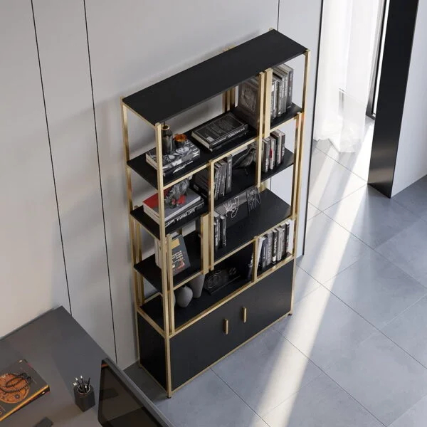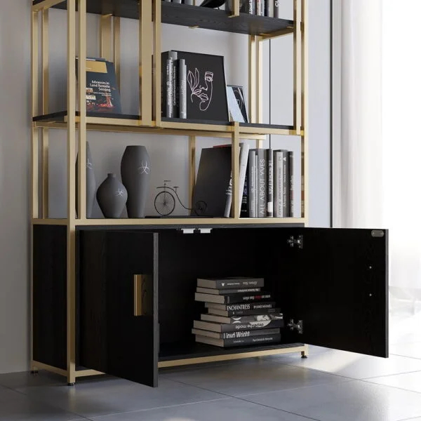 تشتمل المكتبة على خمس طبقات واسعة يمكن استغلالها لعرض مجموعات الكتب، التحف الفنية، والإطارات التذكارية، مما يسمح لك بإضافة لمسة من شخصيتك وذوقك الخاص إلى الغرفة. ولتعزيز الجانب العملي، تم تزويد المكتبة بخزانة سفلية مغلقة بأبواب، وهي مثالية لحفظ وتنظيم المستلزمات التي قد لا ترغب في عرضها، مما يحافظ على المظهر العام للمكان هادئاً ومرتباً.