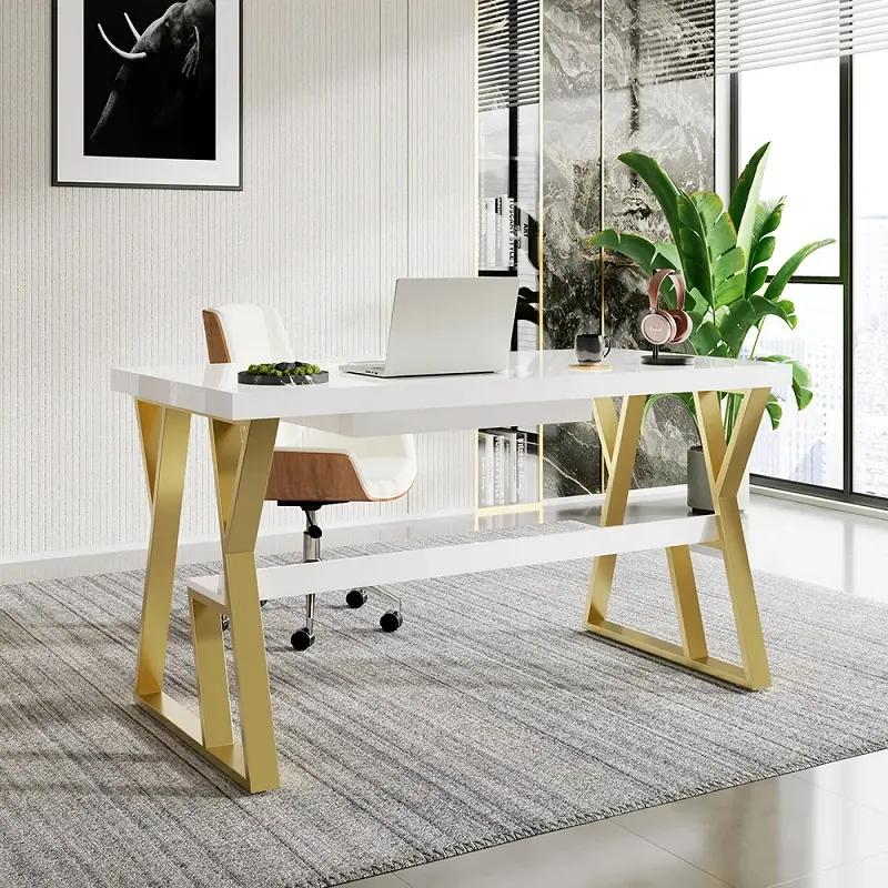 طاولة مكتب بتصميم عصري مع أرجل ذهبية السطح مصنوع من خشب هنسي فاخر قوي متين عالي الجودة وخشب زان روماني قوي متين عالي الجودة تمنح ثباتًا واعتمادية للاستخدام المتكرر. أما القاعدة فهي معدنية بتصميم داعم علي شكل ( X ) يمنح استقرارًا أفضل، لتشعر بالثقة أثناء الكتابة أو استخدام الأجهزة.