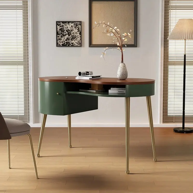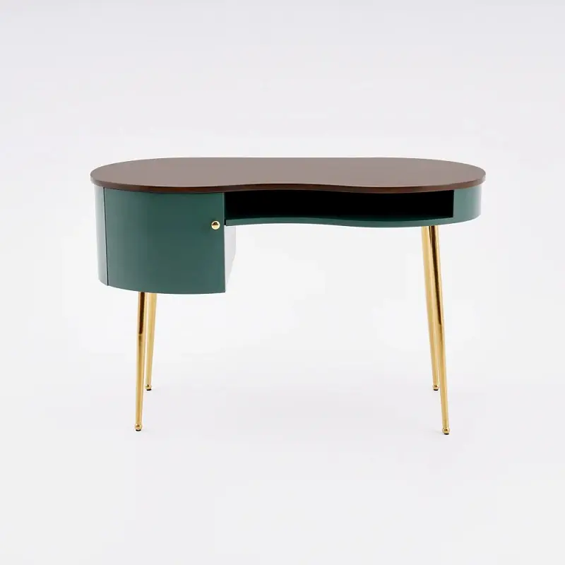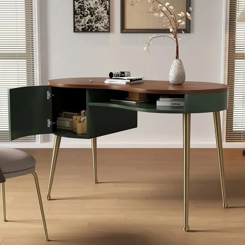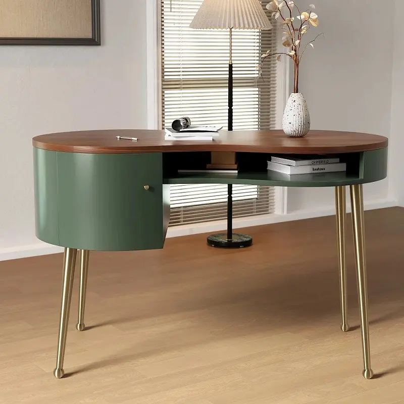 سطح المكتب يأتي بمزيج متناغم من اللون البني والأخضر، بينما القاعدة تتميز باللون الذهبي الجذاب.