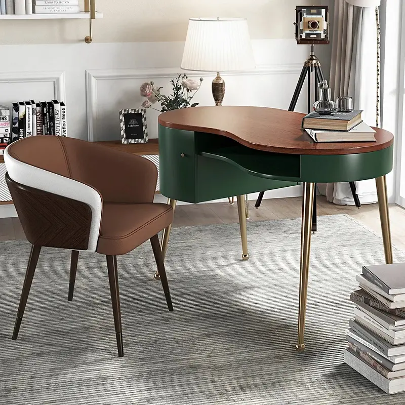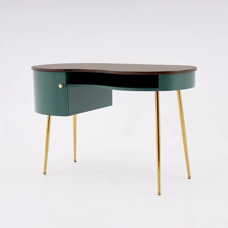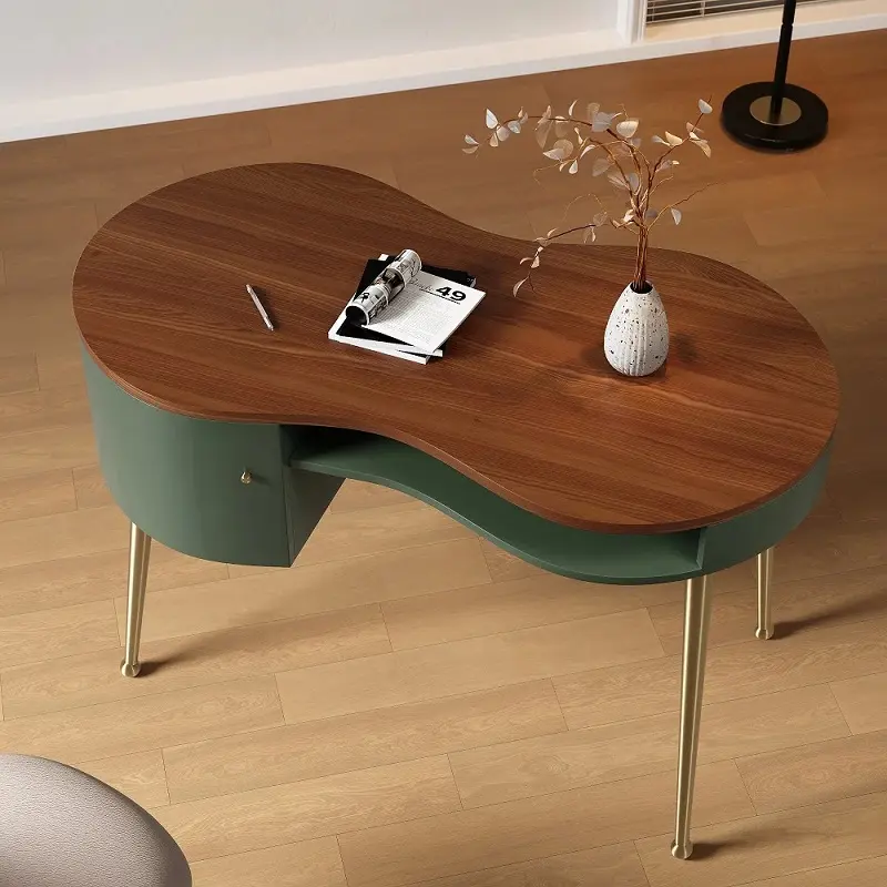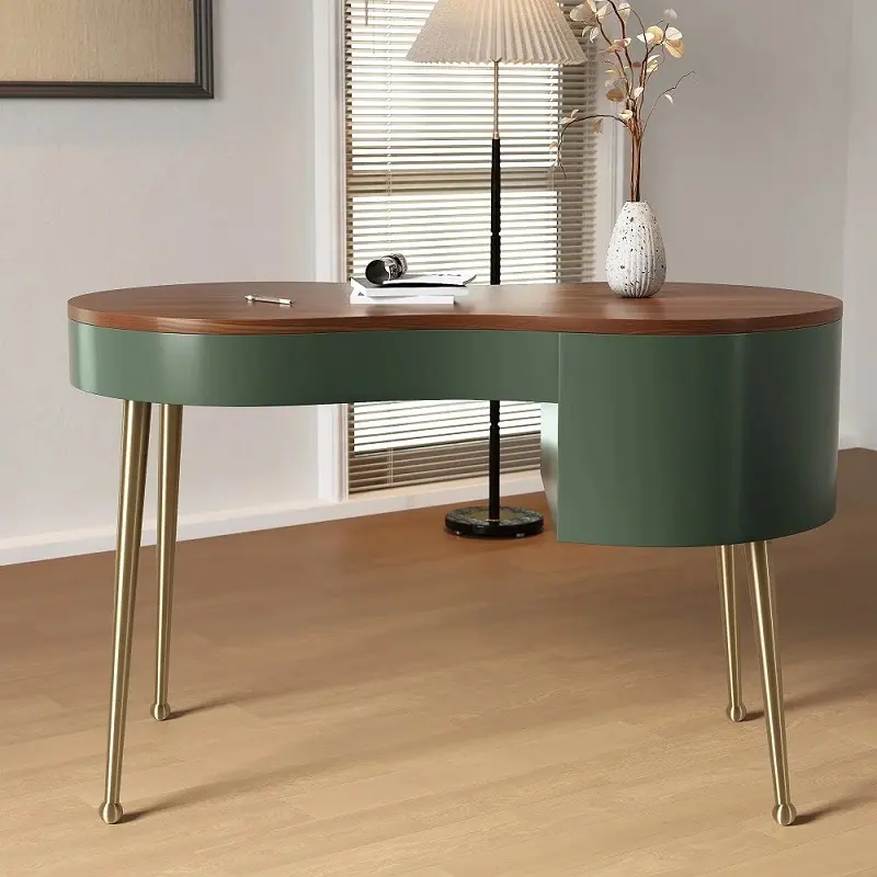 مكتب منحني بتصميم عصري خشب هندسي وخشب زان روماني عالي الجودة، مع قاعدة من الفولاذ المقاوم للصدأ بلمسة ذهبية.