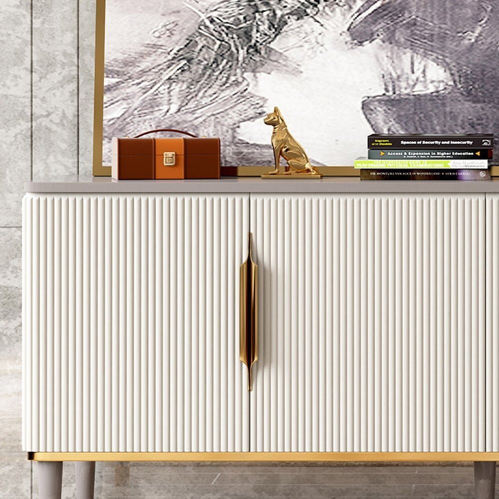 هذه طاولة تلفاز تجمع بين الخطوط العصرية والتفاصيل المموجة التي تمنحها حضورًا مميزًا داخل غرفة المعيشة أو غرفة النوم. الواجهة بتفاصيل أنيقة وتشطيبات معدنية بلون ذهبي تعطي إحساسًا بالفخامة دون مبالغة، لتناسب أنماط ديكور متعددة من الحديث إلى المودرن الكلاسيك.