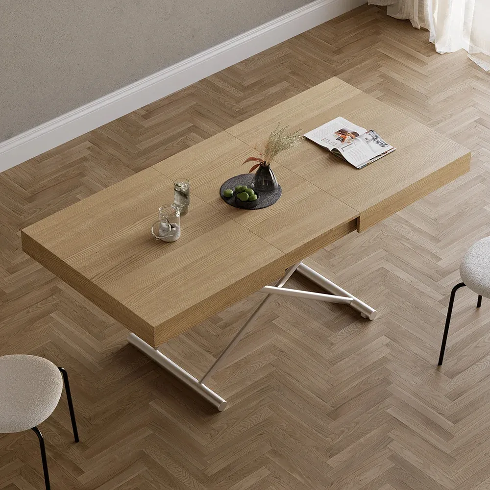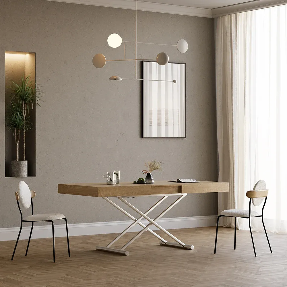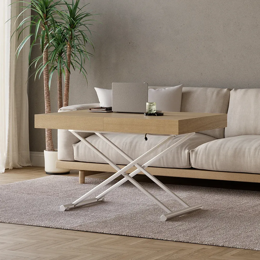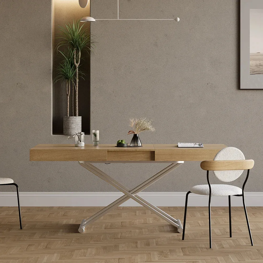 طاولة قهوة متعددة الوظائف طاولة متعددة الاستخدامات بلمسة خشبية دافئة وقاعدة معدنية متينة، تتحول بمرونة من طاولة قهوة مريحة إلى طاولة طعام واسعة، مع إمكانية تعديل ارتفاعها لتناسب كل مناسبة. تصميم عصري مثالي للمساحات الذكية.