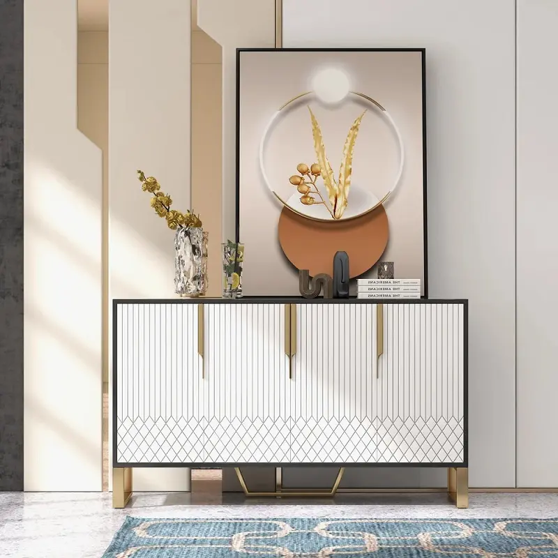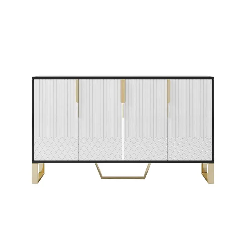 واجهة البوفيه تأتي بلمسات هندسية تمنح المكان طابعاً مرتباً وراقياً، مع أربعة أبواب تتيح وصولاً سهلاً إلى المحتويات. هذا النوع من بوفيه التخزين يريحك في الاستخدام اليومي، خصوصاً عند تجهيز السفرة أو ترتيب مستلزمات الضيافة، ويمنحك مساحة عملية ضمن طاولة بوفيه أو بجانب طاولة الطعام.