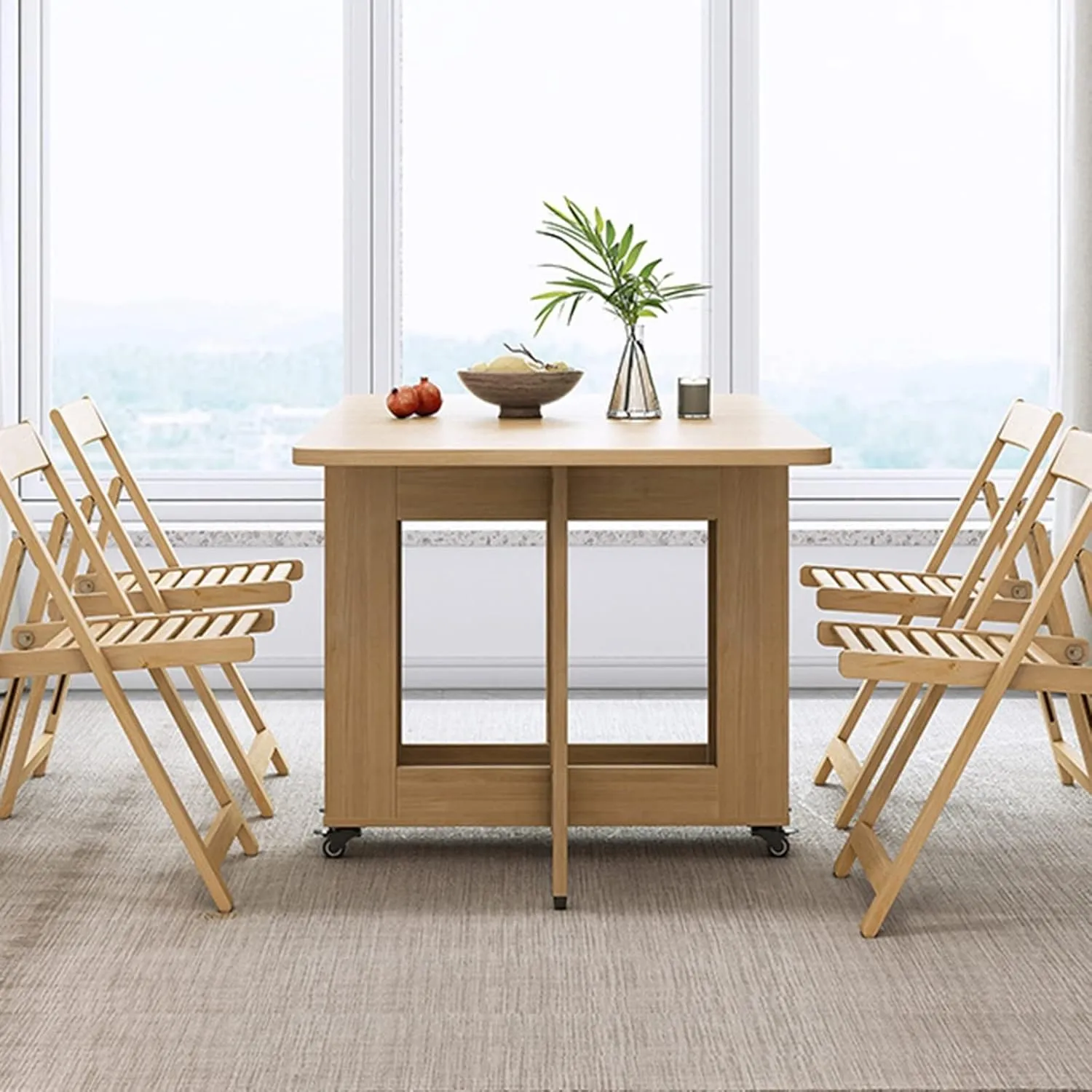 طاولة طعام قابلة للطي بتصميم عصري مع كراسي صُنعت الطاولة من خشب زان متين عالي الجودة، مدعومة بهيكل داخلي من خشب هندسي يمنحها الثبات والمتانة العالية التي تدوم لسنوات طويلة. الكراسي تأتي بتصميم مريح يوفر دعمًا مثاليًا للجلوس لفترات طويلة، سواء خلال تناول الطعام أو أثناء الجلسات العائلية.