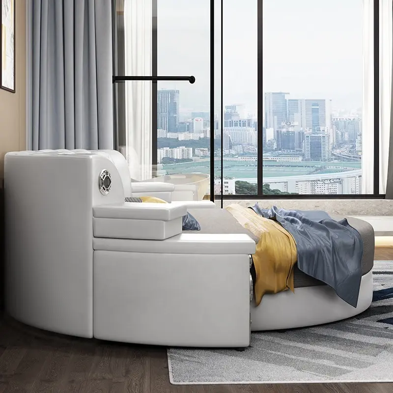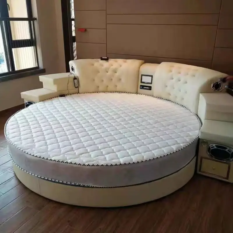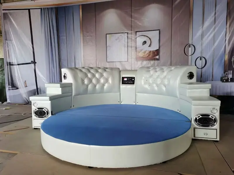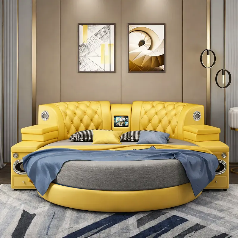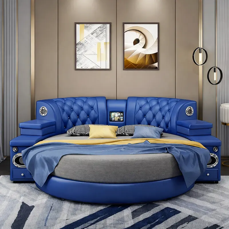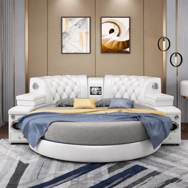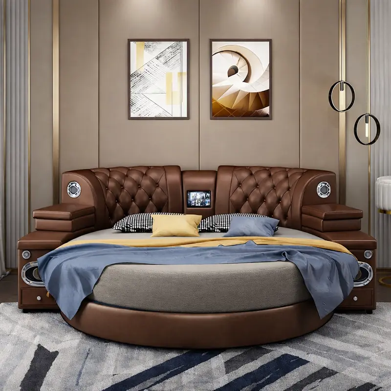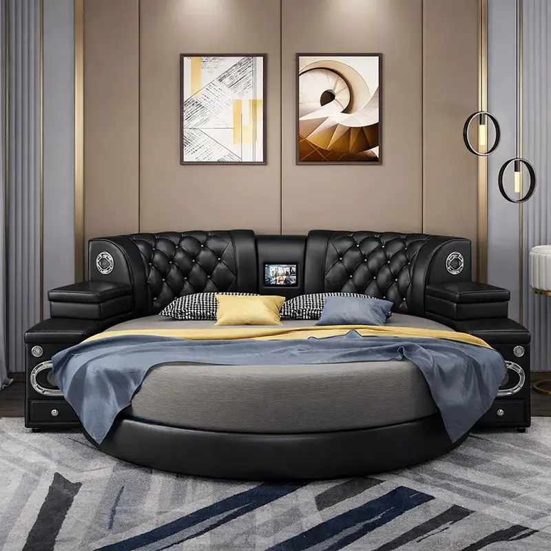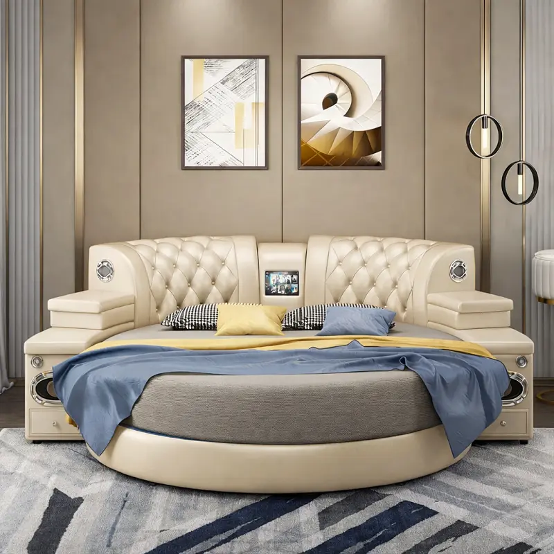 round bed Elegant with multiple features. Made from the finest materials, including an engineered wood frame and high-quality Roman beech wood, and a layer of luxurious Italian leather. It's also lined with high-density, resilient foam to provide comfort and support while you sleep.