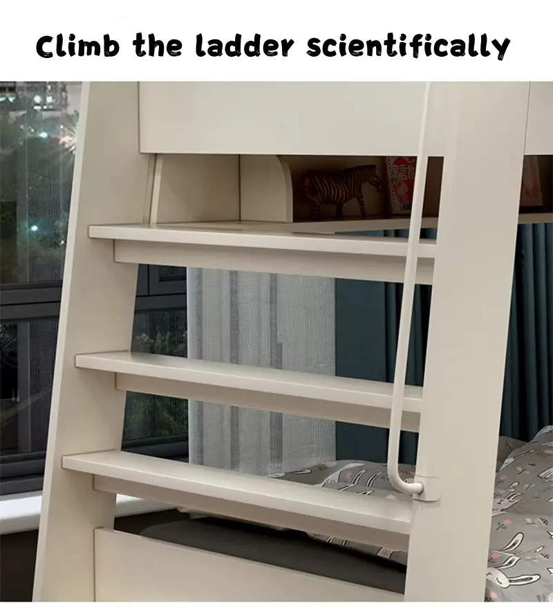 - السرير العلوي مزود بحواف مرتفعة متينة لحماية الطفل من السقوط، مع سلم جانبي ثابت ومتين يسهل الصعود والنزول بأمان تام.