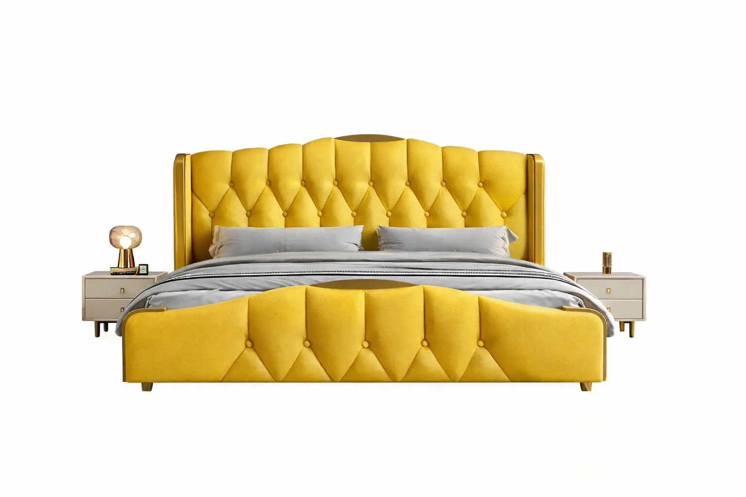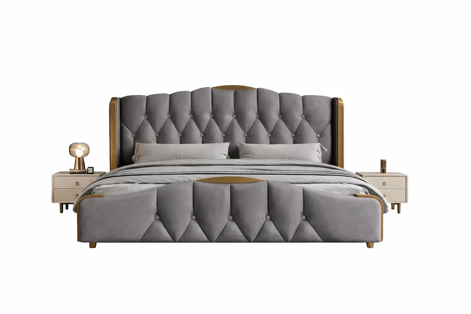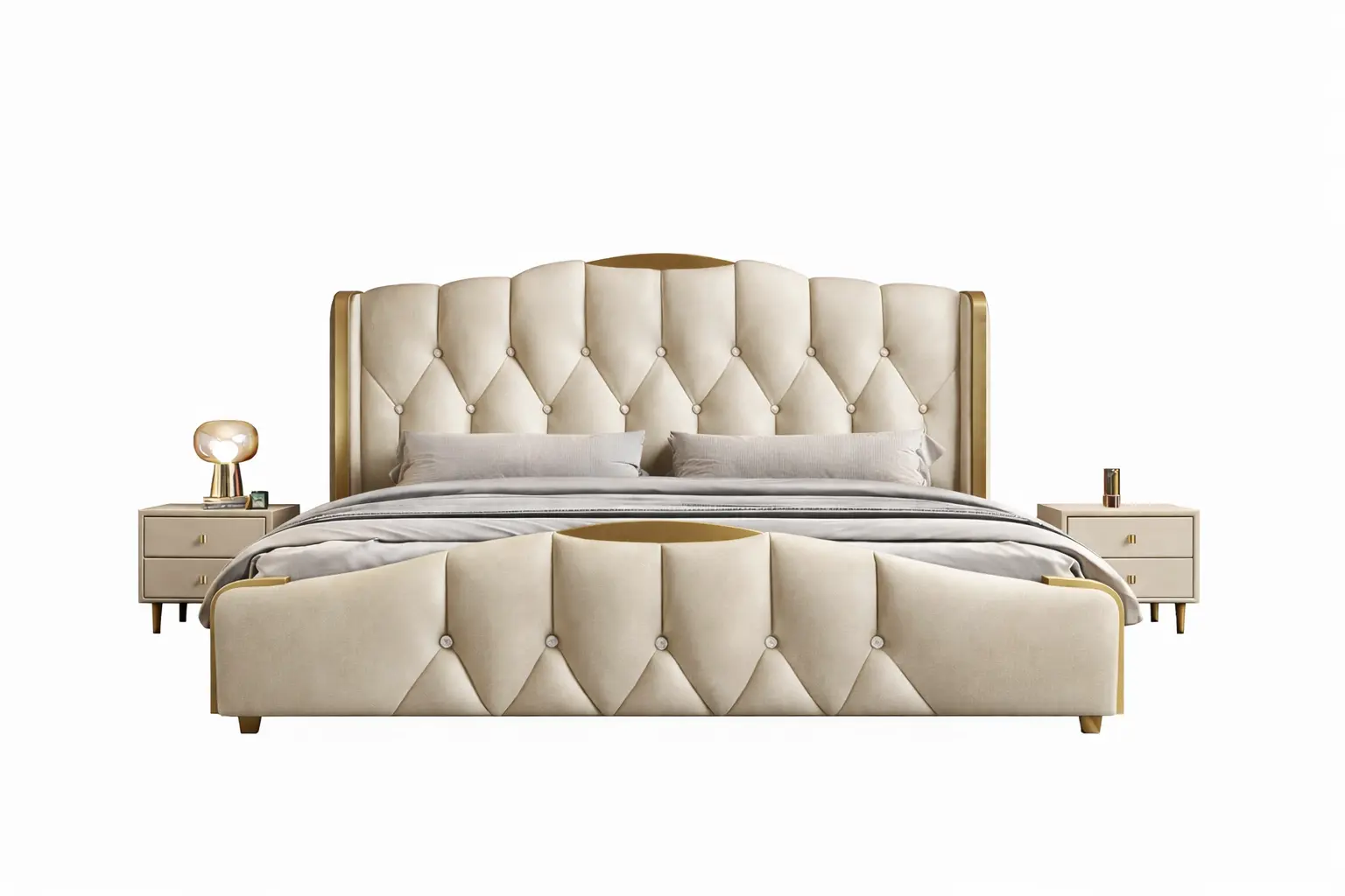الخامات المستخدمة في تصنيع الأسرة تشمل خشب هندسي وخشب زان روماني عالي الجودة، مع إطار من الستيل المذهب الصلب المغطى بالجلد الإيطالي الفخم والمبطن بالإسفنج عالي الكثافة.