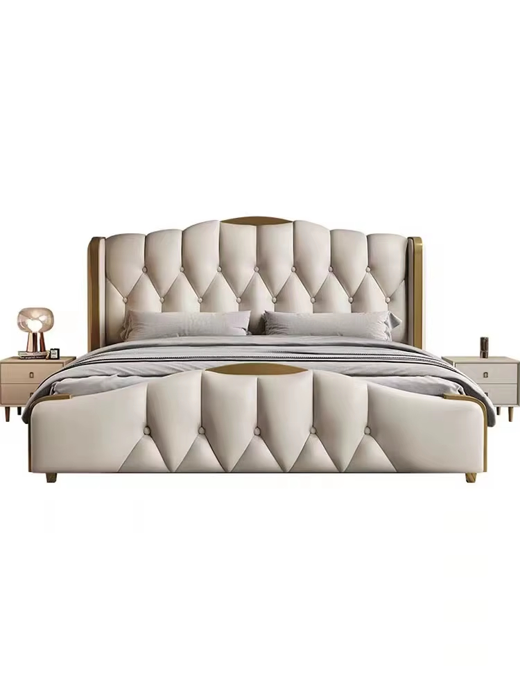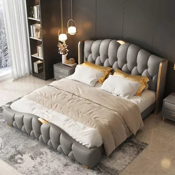 queen bed With a distinctive royal design, this bed features a luxurious royal design that makes it a distinctive piece of art in any bedroom. The frame is made of high-quality engineered wood and Romanian beech wood, with a layer of luxurious Italian leather that adds a touch of elegance and sophistication.