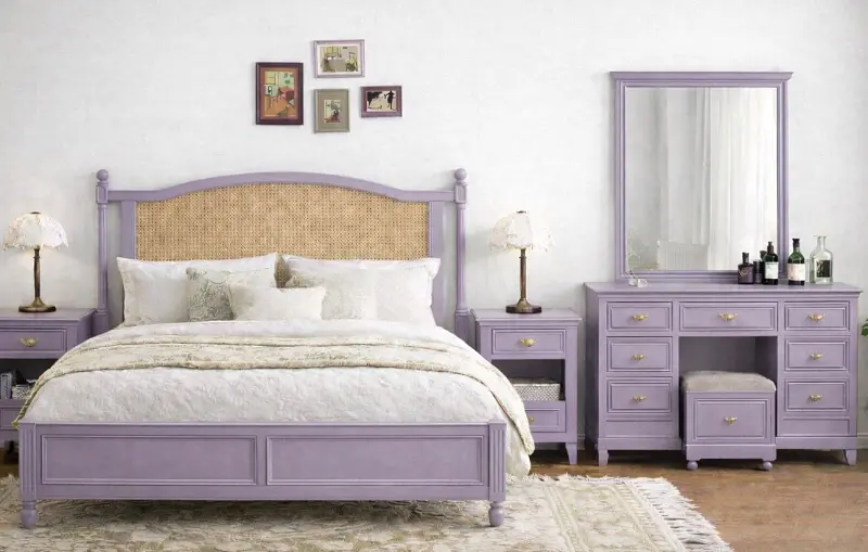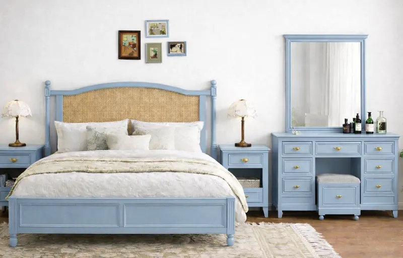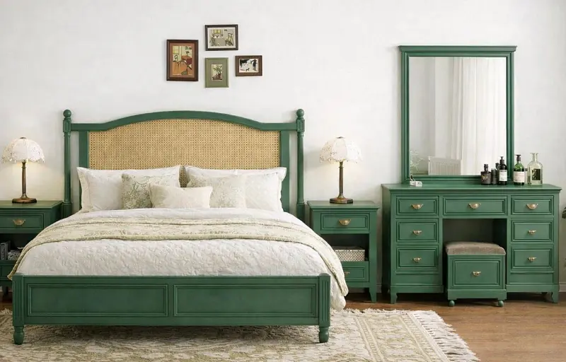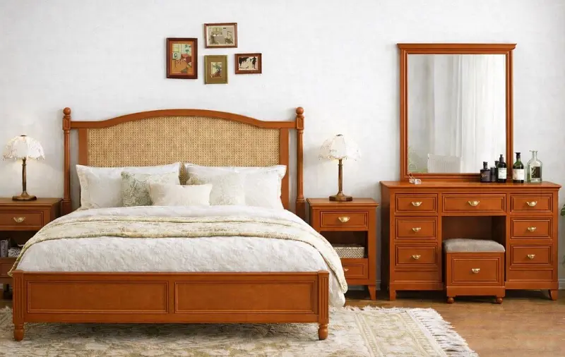 غرفة نوم ريفية تجمع بين الراحة والمتانة، مناسبة للاستخدام اليومي في المنازل العائلية، وسهلة العناية والتنظيف عند الحاجة.