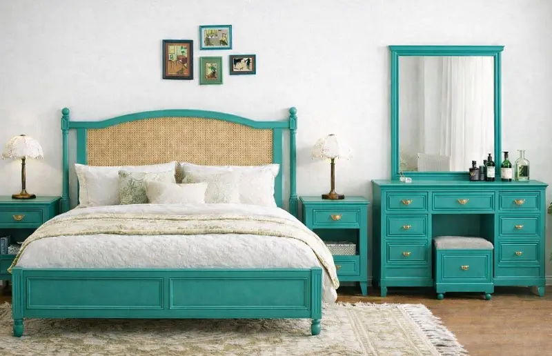 تم تصنيع الهيكل من خشب مدعّم بـ خشب زان متين عالي الجودة، ما يمنح الغرفة ثباتًا واعتمادًا طويل الأمد. هذا النوع من أثاث غرف نوم مناسب للأسر التي تفضل المتانة مع تصميم واضح وغير متكلف. كما أن السطح سهل التنظيف باستخدام مسحة خفيفة فقط عند الحاجة، دون متطلبات عناية معقدة.