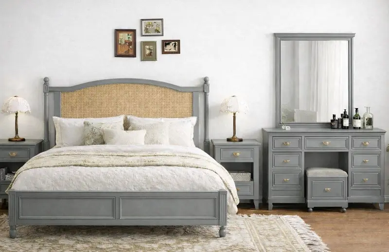 يشمل طقم غرفة نوم كامل سريرًا مريحًا، وتسريحة عملية، و2 كمودينة مناسبة للاستخدام اليومي، ليغطي الاحتياجات الأساسية لغرف النوم الجاهزة. التصميم الريفي يمنح الغرفة حضورًا هادئًا يتماشى مع أنماط متعددة من الديكور.