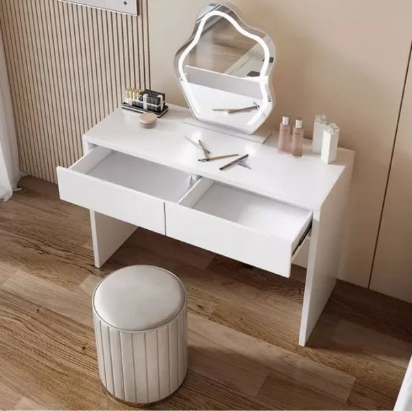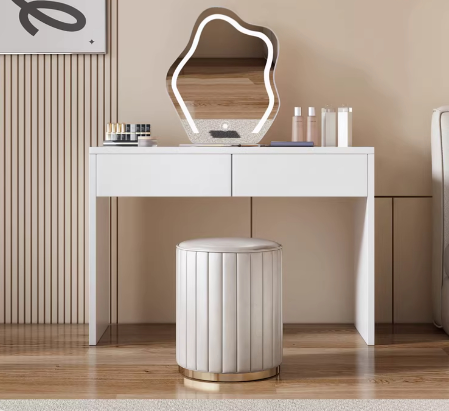 - والتسريحة تتميز أيضًا بأناقتها مع مرآة بشكل انسيابي وأدراج لتخزين مستلزماتك اليومية مما يجعل وقت استعدادك اليومي أكثر راحة.