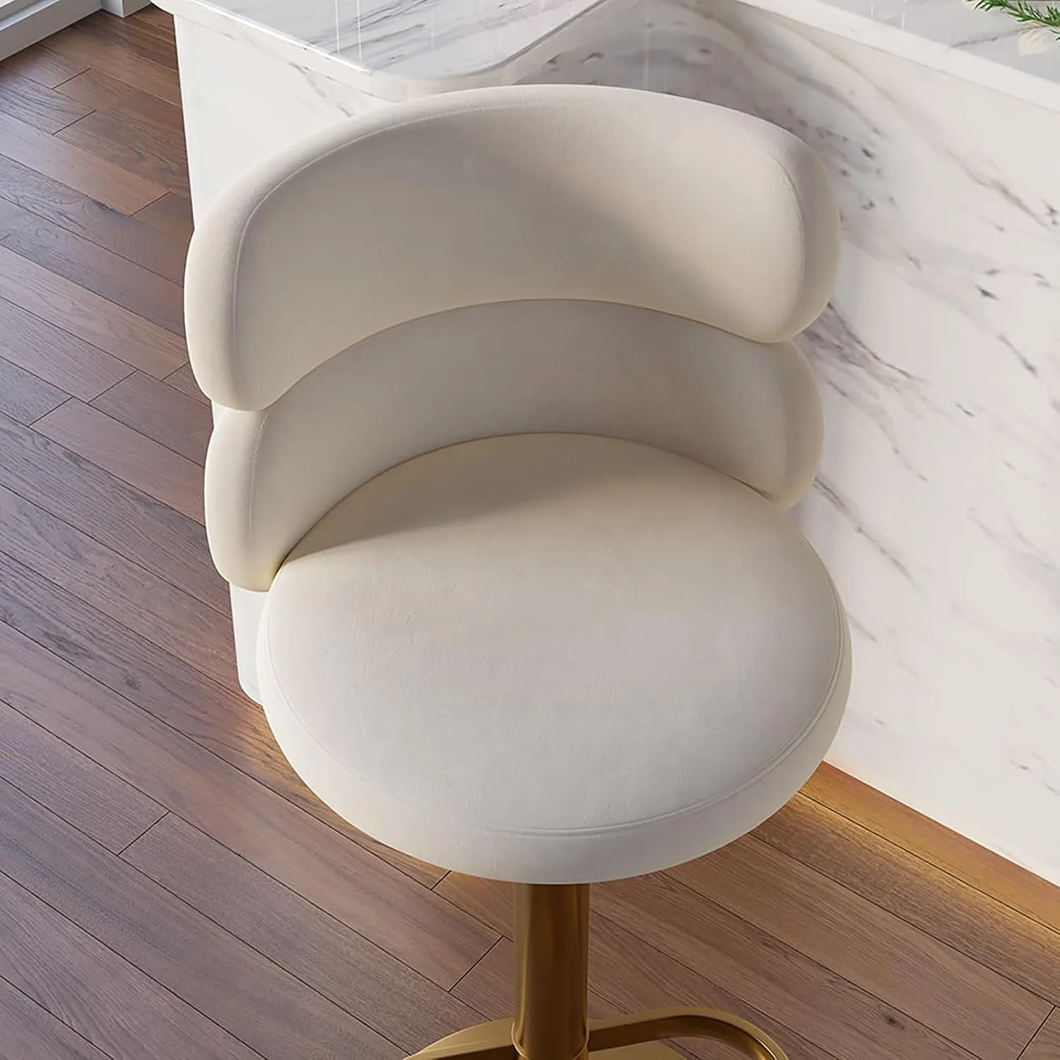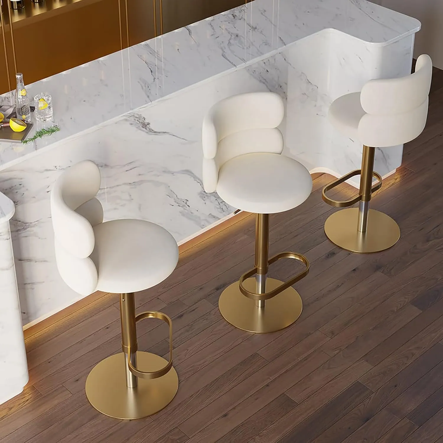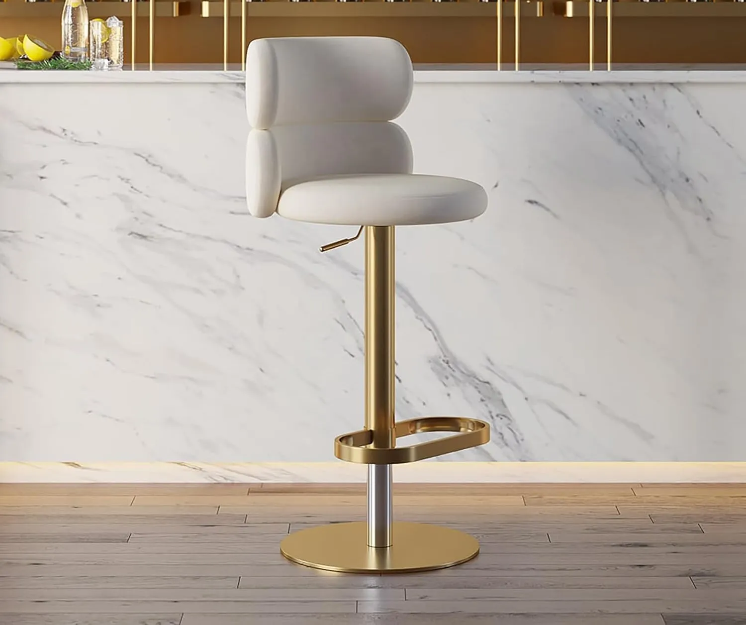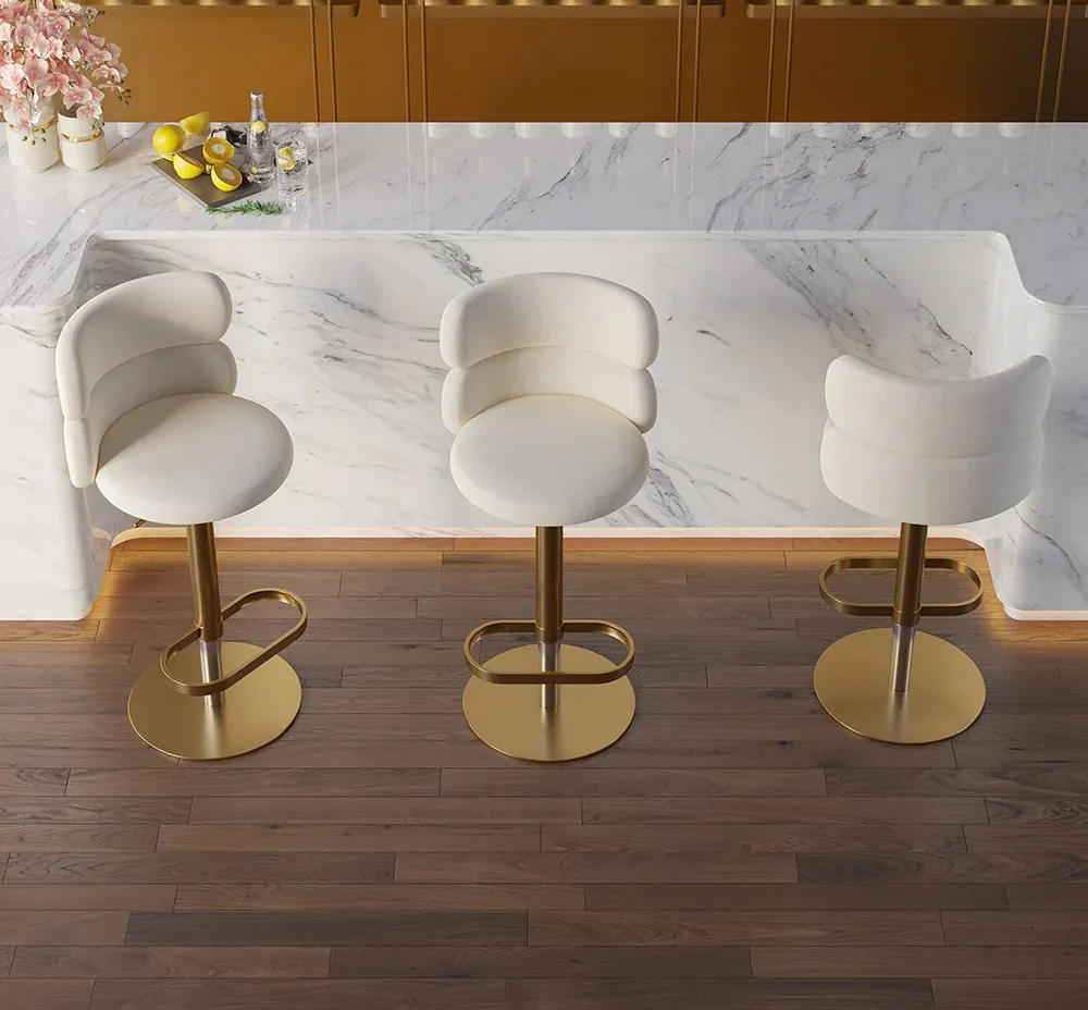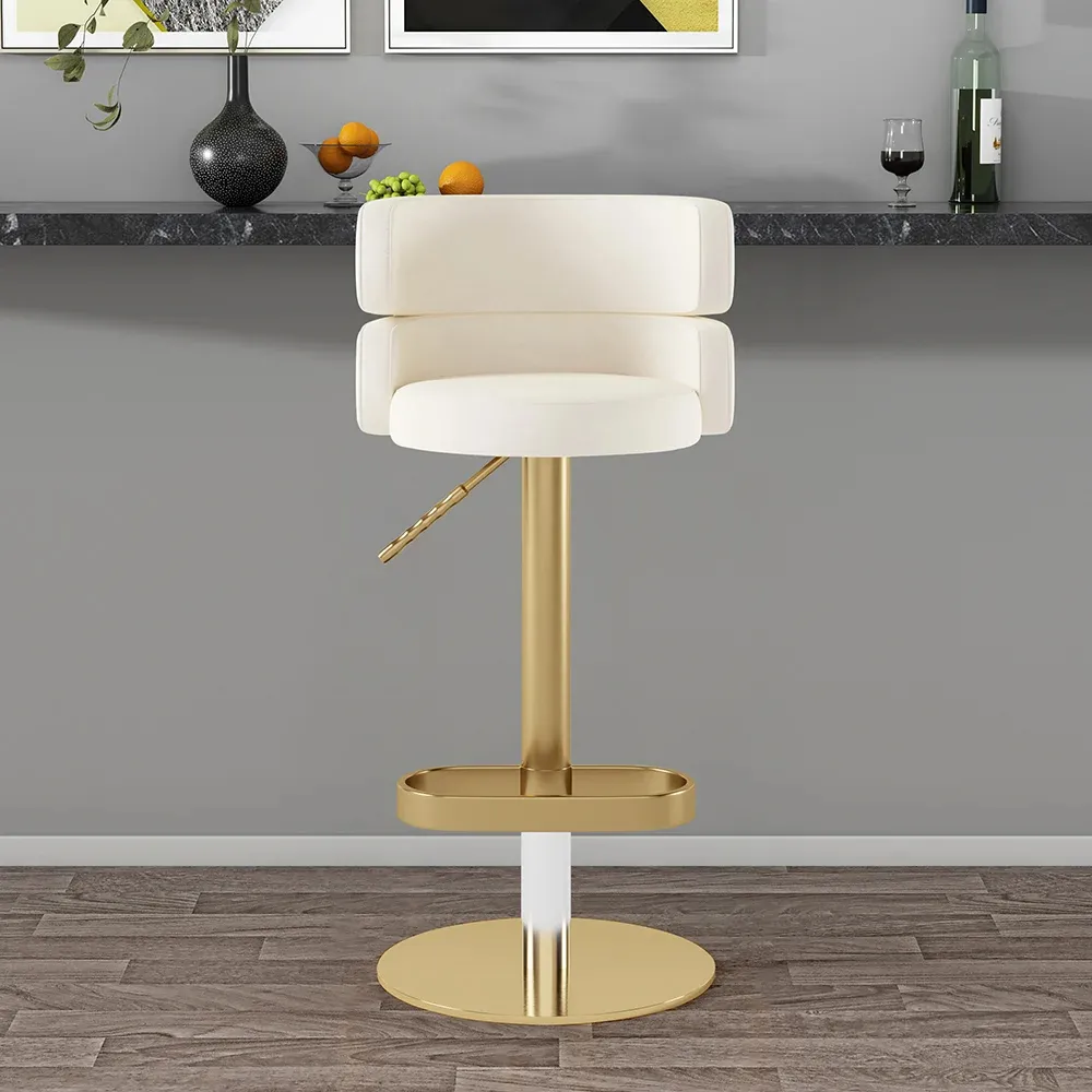 كرسي بار دوار بمسند ظهر منحني يصلح كرسي بار أو كرسي طعام أنيق يجمع بين الراحة والتصميم العصري، مصنوع من خامات عالية الجودة، بلون أبيض مع لمسات ذهبية جذابة، مثالي لغرف الطعام وغرف المعيشة
