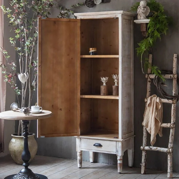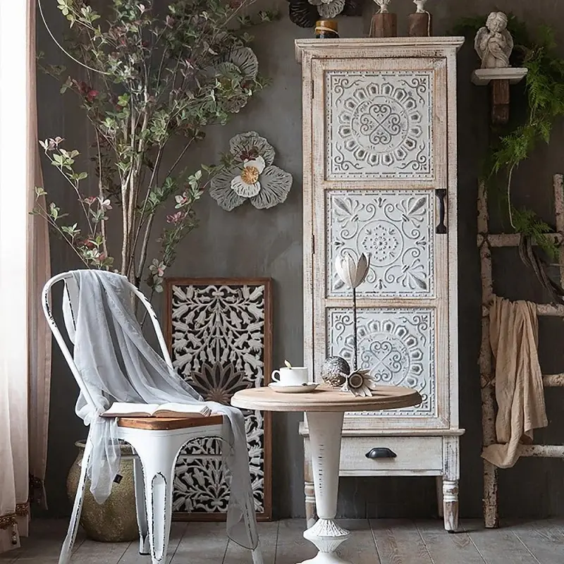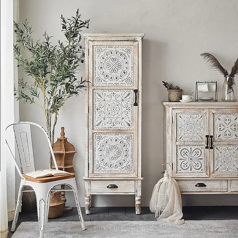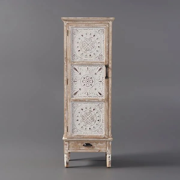 خزانة تخزين أنيقة بطابع ريفي ناعم ونقوش محفورة تضيف حضورًا دافئًا للمكان، مع باب مزخرف ودرج لتجميع الأغراض وتنظيمها بشكل مرتب وسهل.