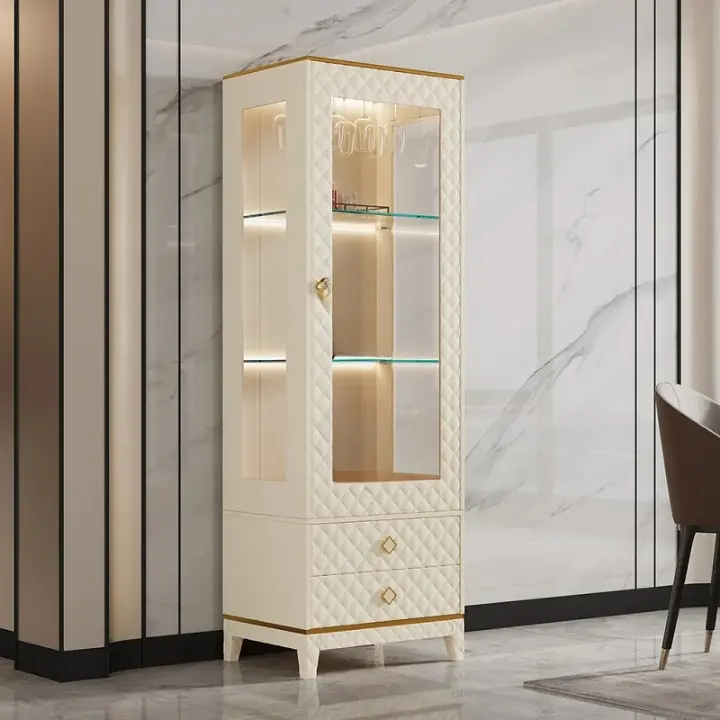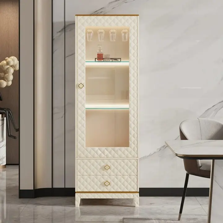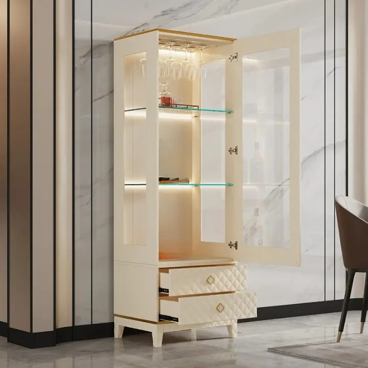 خزانة بار مودرن مع إضاءة وأبواب زجاجية، تصميم فاخر وأنيق يوفر تخزينًا عمليًا لزجاجات وأدوات البار.